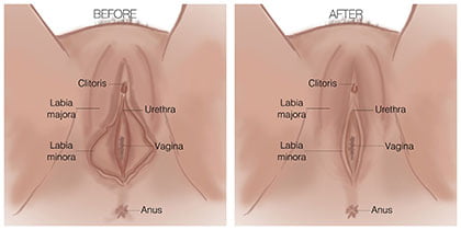Durante l’intervento, il chirurgo rimodella le piccole labbra rimuovendo il tessuto in eccesso, mantenendo proporzioni naturali e funzionali. Per avere un’idea del risultato della labioplastica vedere l’immagine sotto riportata.